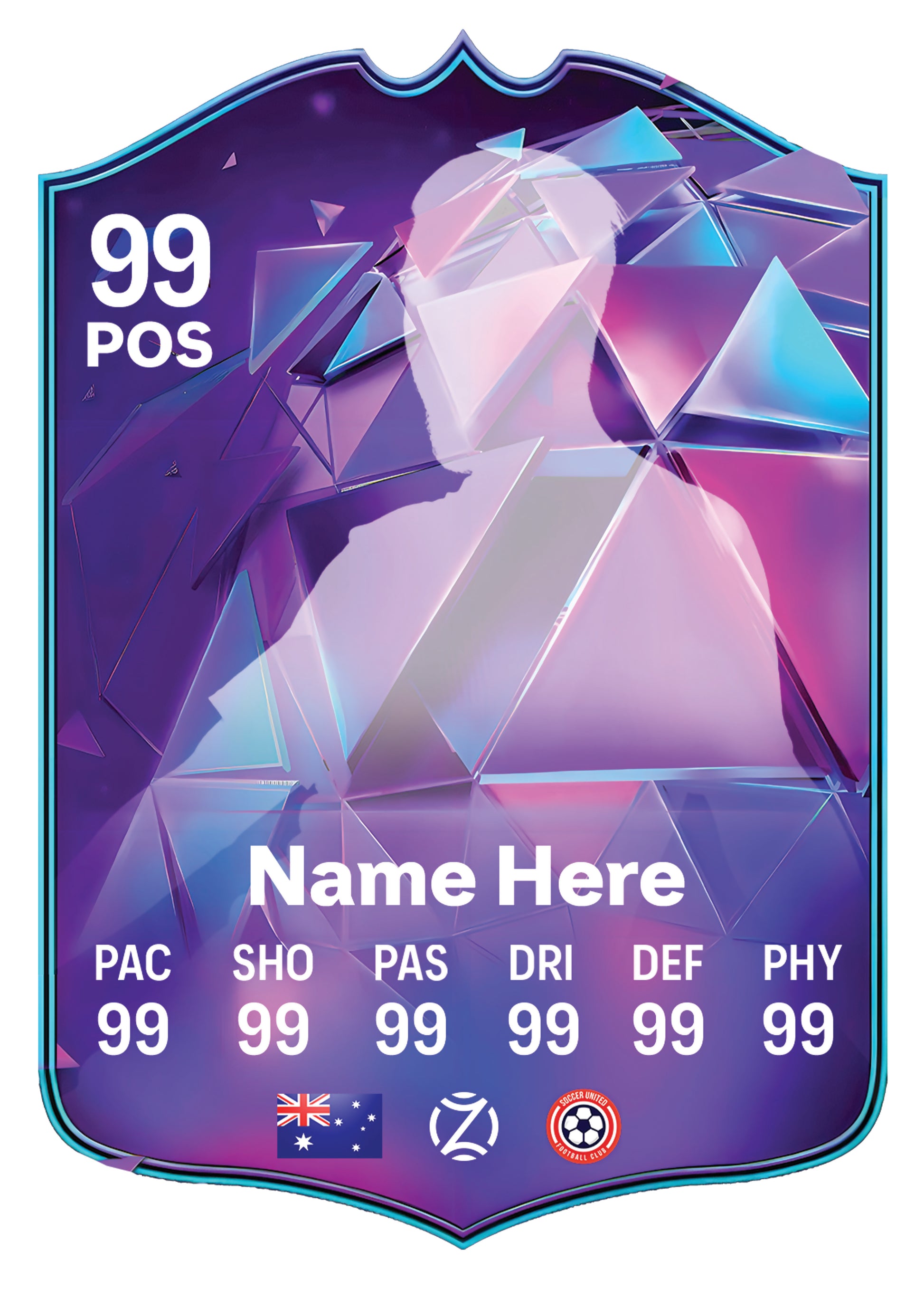 Featuring a vibrant prism-like background with deep purples, blues, and pinks, this design blends futuristic flair with nostalgic depth. The silhouette layout and maxed-out stats give your photo a bold, commemorative presence — perfect for marking a retirement, a final season, or a personal football milestone.